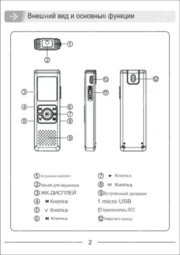 Повернуть диктофон в свою сторону дисплеем. Вверху находятся разъем для наушников и два микрофонных канала; справа переключатель аудио записи ВКЛ – ВЫКЛЮЧЕНО; лицевая часть дисплей, клавиши вперед – назад, М – входа в меню, V – регулировка звука, в центре клавиша ВКЛ/ВЫКЛ, подтверждение выбора опции в меню при настройке, играть/пауза.